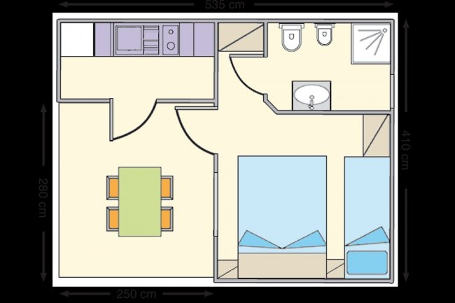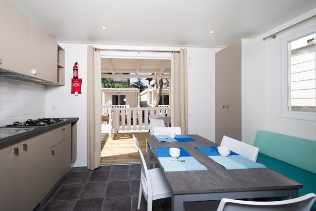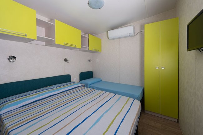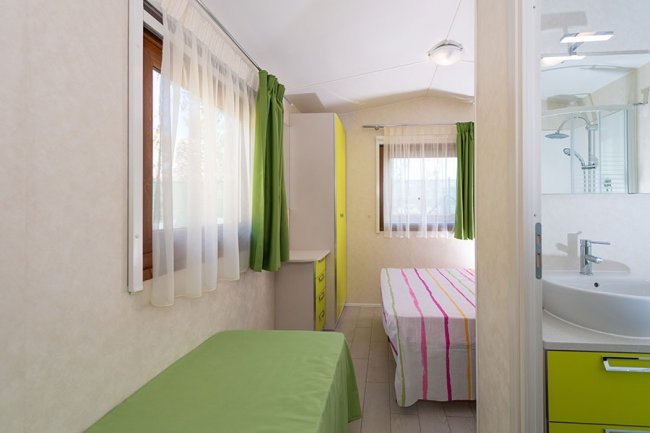 Le case mobili possono ospitare fino a 4 persone. Dispogono di area giorno con angolo cottura attrezzato, bagno con doccia, e veranda esterna. Le tipologie monolocali hanno i posti letto nell'area giorno e i bilocali dispongono di una camera da letto.