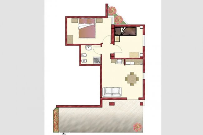 camera matrimoniale, divano letto, angolo cottura, box doccia, balcone arredato.