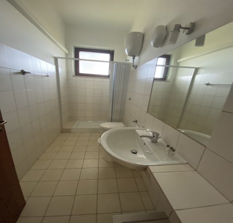 Bagno con doccia, lavandino e WC, finestra sopra.