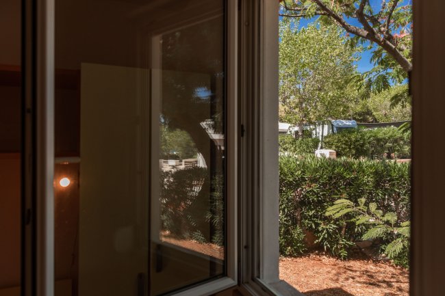 Vista di un giardino verde attraverso una finestra aperta.