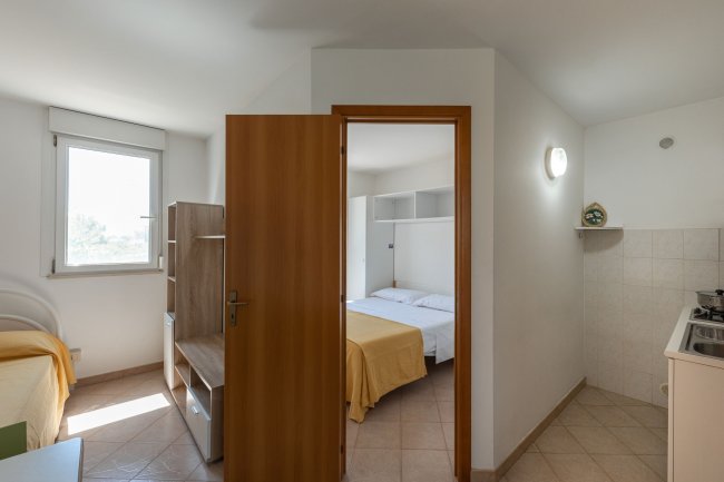 Entrata verso camera da letto e cucina, letto matrimoniale visibile.