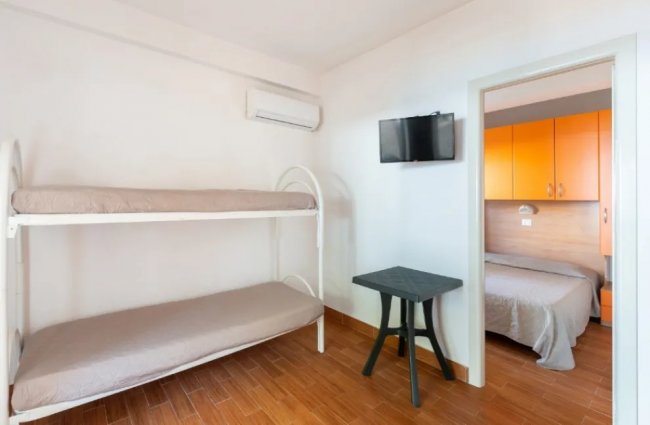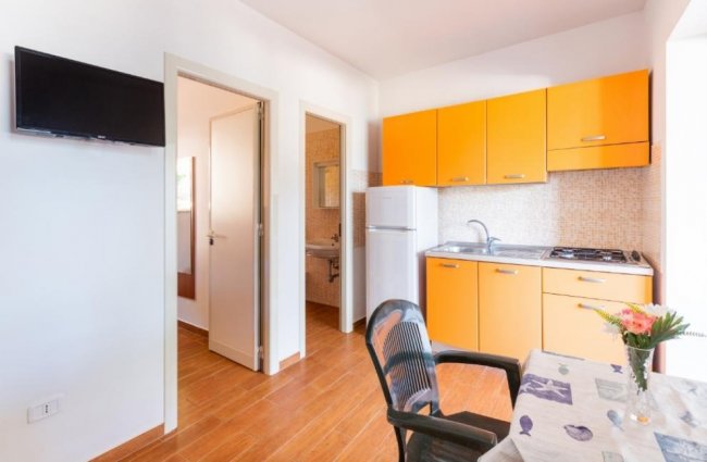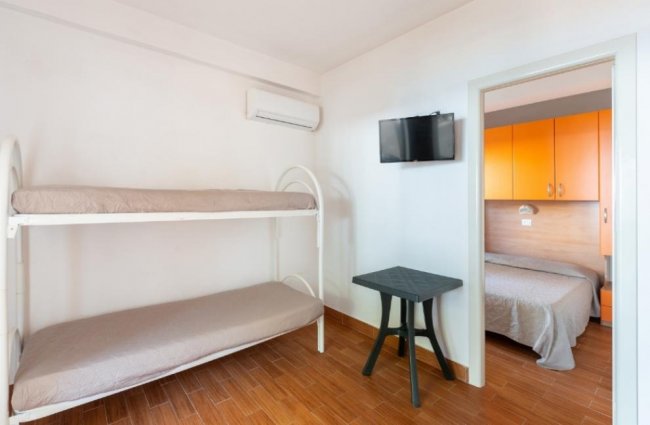 MONOLOCALE 2+2 PERSONE - Posto in palazzina, si compone di unico ambiente con letto matrimoniale più letto a castello, angolo cottura, bagno con doccia, veranda coperta e attrezzata; (in quanto si mangia in veranda).L’appartamento monolocale 2+2 posti situato all’interno di una palazzina di recente costruzione, disponibile a piano terra, primo o secondo piano. La veranda è chiusa utile per chi possiede un animale.