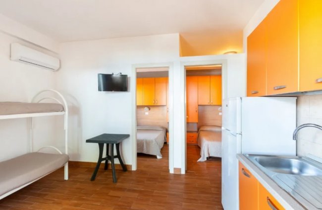BILOCALE 2/4 PERSONE - Si compone di una camera da letto matrimoniale, ingresso con angolo cottura più letto a castello o divano letto, bagno con doccia, veranda coperta e attrezzata; (in quanto si mangia in veranda)