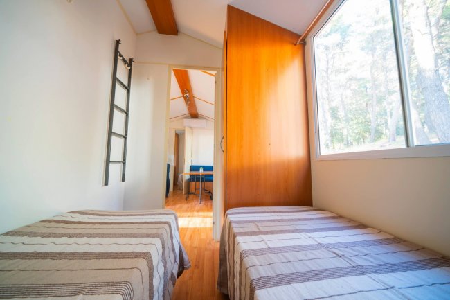 - 5+1 posti: con area giornoo, angolo cottura, divano letto singolo, camera matrimoniale, camera con 3 letti singoli, bagno con doccia, aria condizionata e veranda esterna.